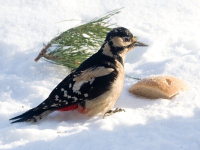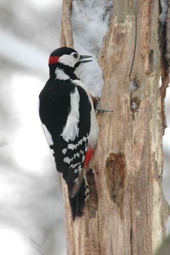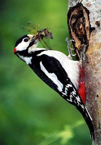 Дятел строкатий простукуючи стовбур дерева, відшукує найбільш пошкоджене місце на стовбурі дерева, на висоті на висоті 2— 8 м від землі, дятли видовбують собі дупло, в якому гніздяться. Дупло має глибину 28—35 см, вхідний отвір — льоток має діаметр 5—5,6 см.