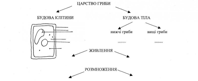 Обладнання: таблиці та малюнки з зображенням грибів колекція "Гриби" , вологі препарати грибів Хід уроку: I. Психологічний настрій на роботу. Перш ніж розпочати урок давайте вияснімо чи всі ми готові до повноцінної роботи. Подивимося один на одного і подаруємо посмішку і пам'ятаємо правило успіху ХОЧУ -------- ► МОЖУ ------ ► РОБЛЮ II. Актуалізація опорних знань. Яке царство живих організмів ми вивчаємо? Що Вам відомо про організми, що належать до царства Гриби? Робота біля дошки : Закінчити схему